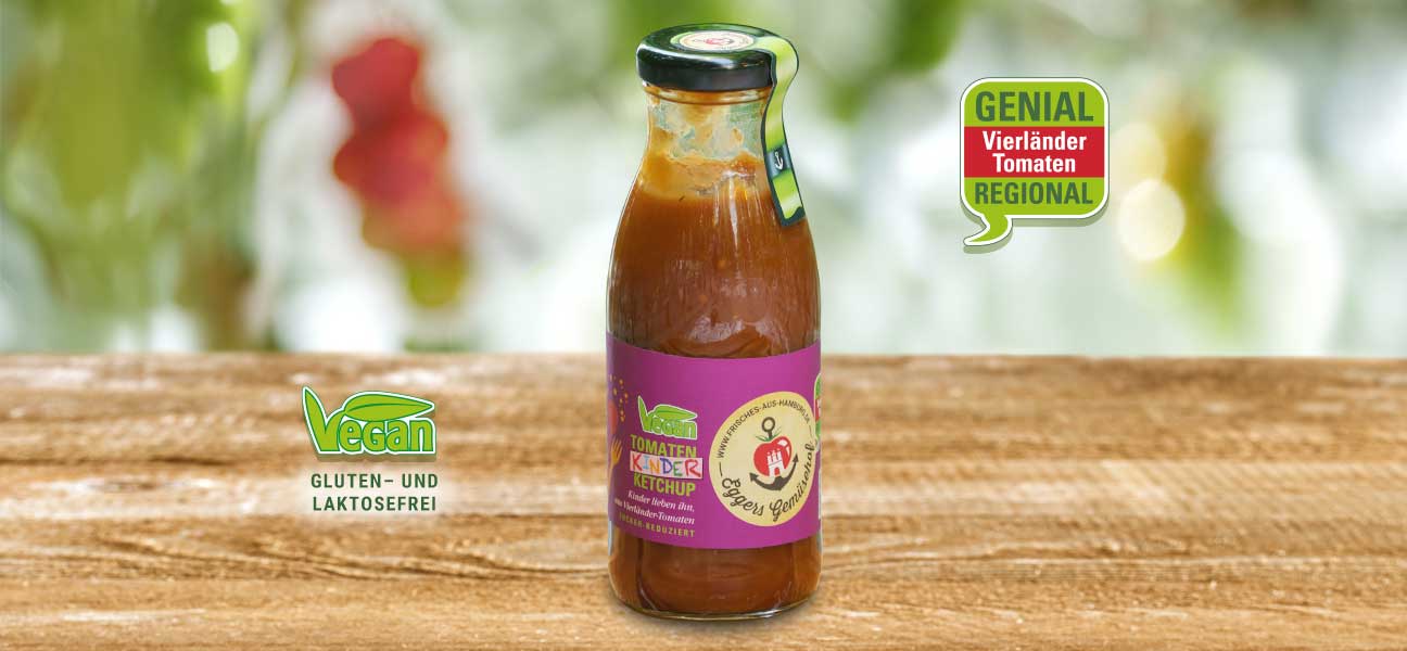 Kinder lieben dieses Ketchup, denn er besteht aus besten, feinwürzigen Vierländer-Tomaten, Wasser, Zuckerrübensirup, Branntweinessig, modifizierte Stärke, Rapsöl, Zucker, Zwiebeln, Speisesalz, Dextrose und Gewürzen und ist somit vegan, gluten- und laktosefrei.