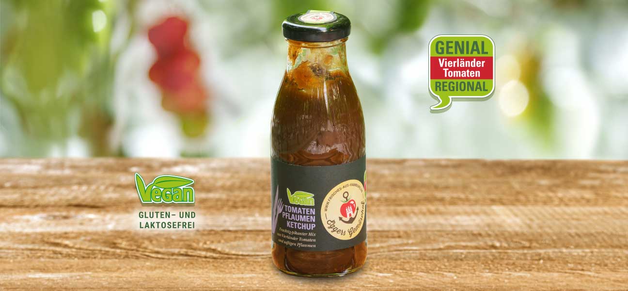 Unser Tomaten-Pflaumen-Ketchup ist fruchtig-pikant durch den leckeren Vierländer-Tomaten-Pflaumen-Mix. Er besteht aus Pflaumenmus (Pflaumen, Glukose-Fruktose-Sirup, Zucker, Karamellsirup, Säuerungsmittel: Citronensäure; Geliermittel: Pektine; Gewürze), Vierländer-Tomaten, Wasser, Branntweinessig, Rapsöl, Zucker, Zwiebeln, modifizierter Stärke, Salz, Dextrose und Gewürzen und ist daher vegan, gluten- und laktosefrei.