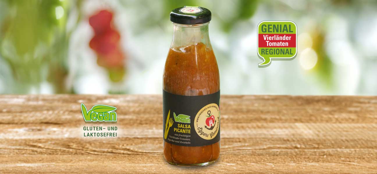Unsere pikante Salsa-Sauce besteht aus fruchtigen Vierländer-Tomaten, Ananas, Wasser, Zucker, Zwiebeln, Branntweinessig, Jalapeño Chilis, Knoblauch, modifizierte Stärke, Salz, Raucharoma, Rapsöl und feinen Gewürzen und ist vegan, gluten- und laktosefrei.