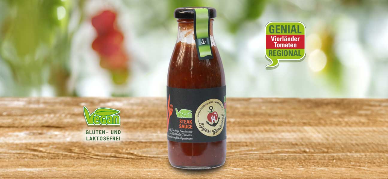 Unsere Tomaten-Steak-Sauce besteht aus fruchtigen Vierländer-Tomaten, Salz, Zucker, Wasser, Branntweinessig, modifizierte Maisstärke, Zitronensaft, Dextrose und Gewürze (Pfeffer, Zwiebel, Knoblauch, Macis, Thymian, Rosmarin und Nelke) und ist daher vegan, gluten- und laktosefrei.