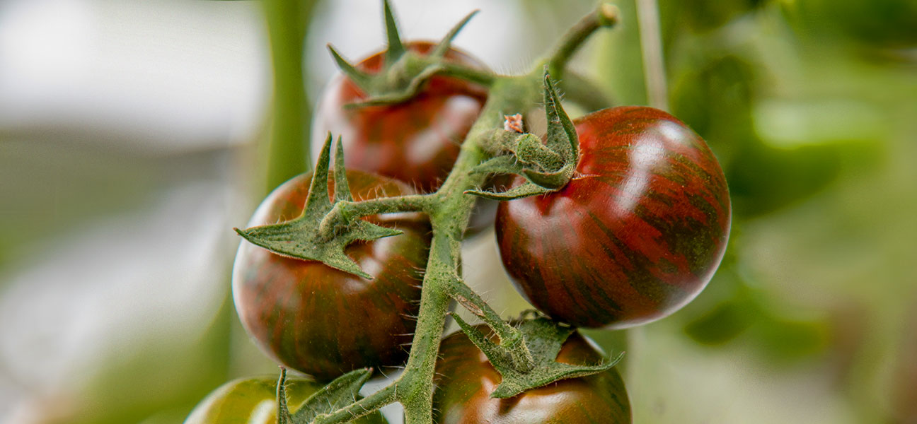 Die Tiger Tomate (20 - 30g) ist eine attraktive, braun-rot gestreifte Geschmackstomate. Die Besonderheit dieser Sorte ist die feste Schale und das ausgeglichene Zucker-Säure-Verhältnis. Sie ist ein Highlight auf jedem Salatteller.